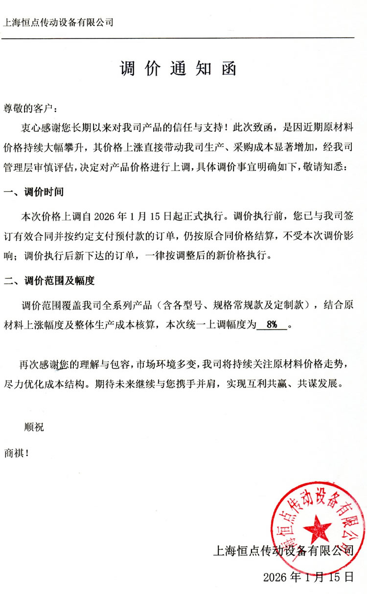 衷心感謝您長期以來對我司産品的信任與支持!此次緻函,是因近期原材料價格持續大幅攀升,其價格上漲直接帶動我司生産、採購成本顯著增加,經我司管理層審慎評估,決定對産品價格進行上調,具體調價事宜明確如下,敬請知悉:
