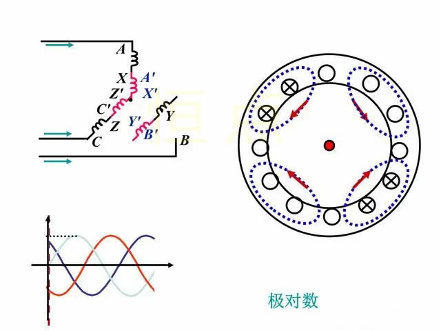 三相交流電機每組線圈都會産(chǎn)生N、S磁極,每個電機每相含有的磁極個數就是極數。由於(yú)磁極是成對出現的,所以電機有2、4、6、8……極之分。