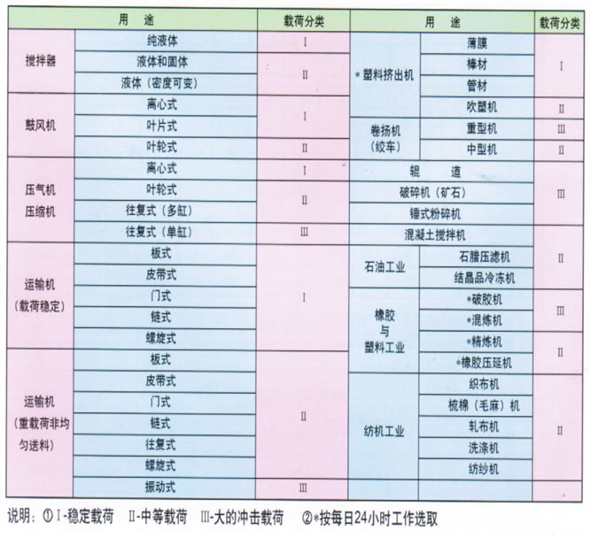 擺線針輪減速機載荷性質分類和負載系數與工作時間關系表