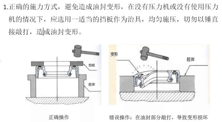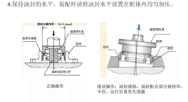 2.油封要平裝,不能有傾斜的現象。建議採(cǎi)用油壓設備(bèi)或套筒工具安裝。壓力不要太大 ,速度要均勻、要慢。