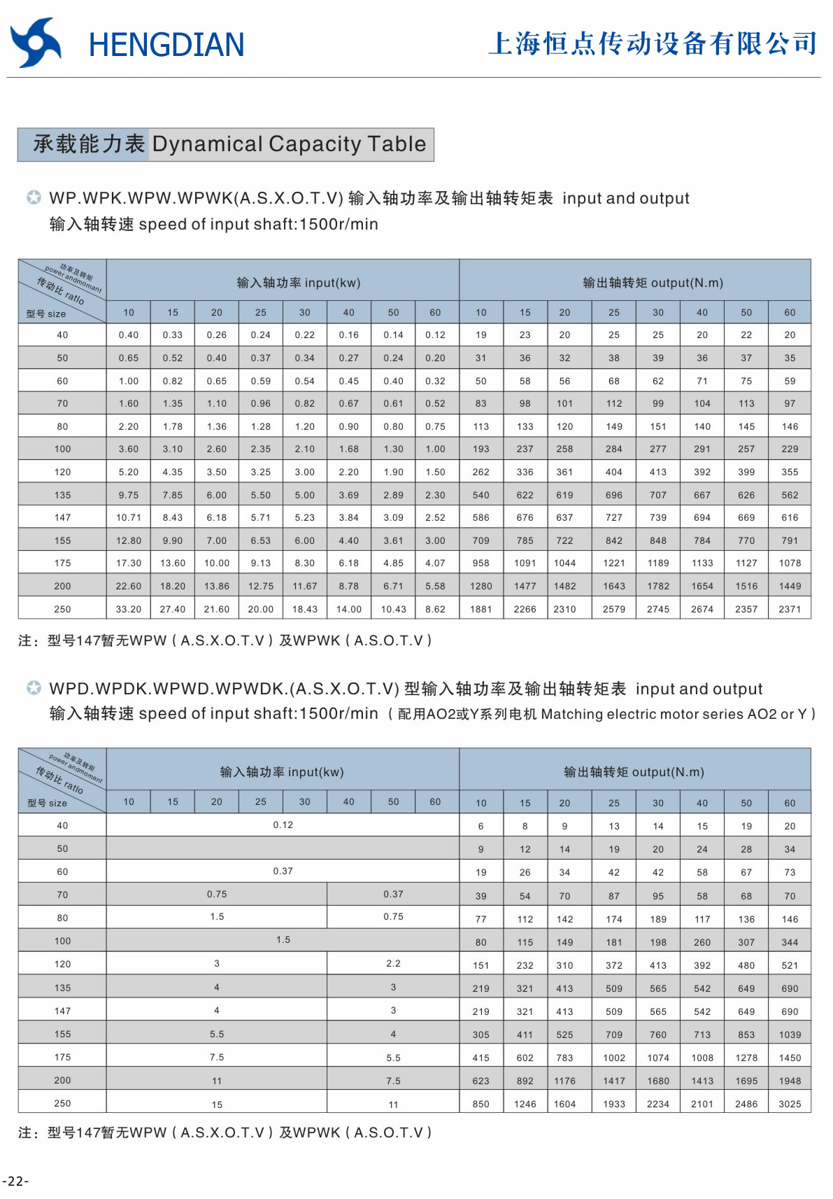WP鑄鐵蝸輪蝸杆減速機,配置方式靈活,具有一定的自鎖能力 ,能适應多種安裝和使用的要求,因此使用範圍廣泛 。但蝸輪蝸杆減速機本身的傳動效率不高,不如行星減速機或者齒輪減速機,所以在選用時要多方考慮 。下面恒點減速機把這類減速機的承載能力表公布下,以便大家查閱: