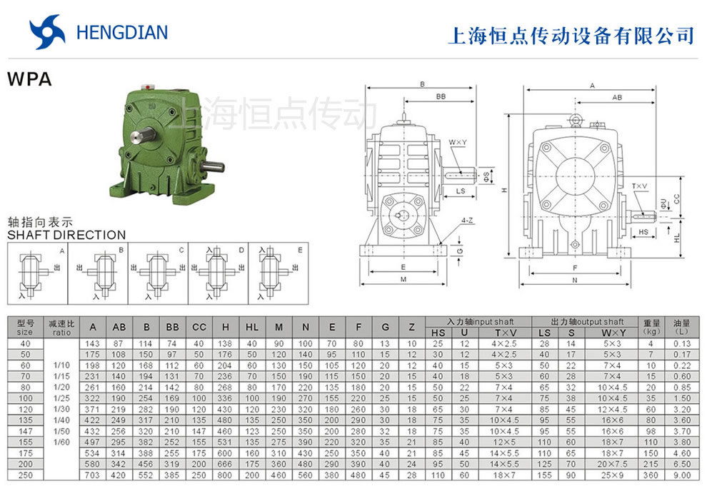 WPA減速機外形尺寸/選型指南 - WP鑄鐵蝸輪蝸杆減速機