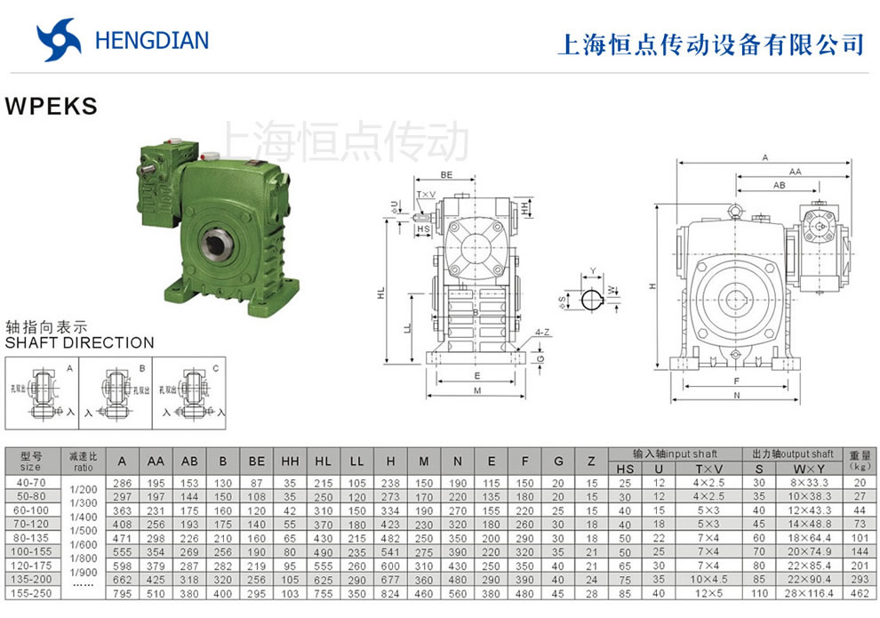 選型指南,WPEKS雙級減速機的外形安裝尺寸.WPEKS雙級減速機軸輸入,孔輸出.WPEKS雙級減速機軸指向表示方法.機座号40-70到155-250,速比200到900.
